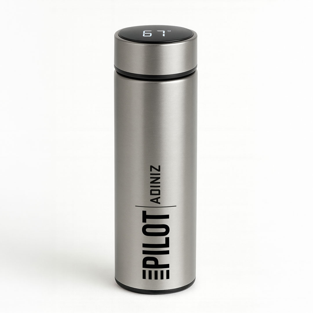 Dijital Göstergeli Termos, gümüş rengi modern çelik gövdesi ile dikkat çeker.