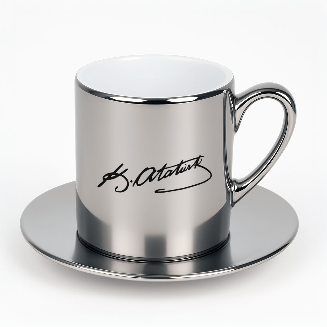 Mustafa Kemal Atatürk’ün asil imzasını taşıyan bu özel tasarım gümüş renk Türk kahvesi fincanı, hem şık hem de anlamlı bir koleksiyon ürünü olarak tasarlandı.