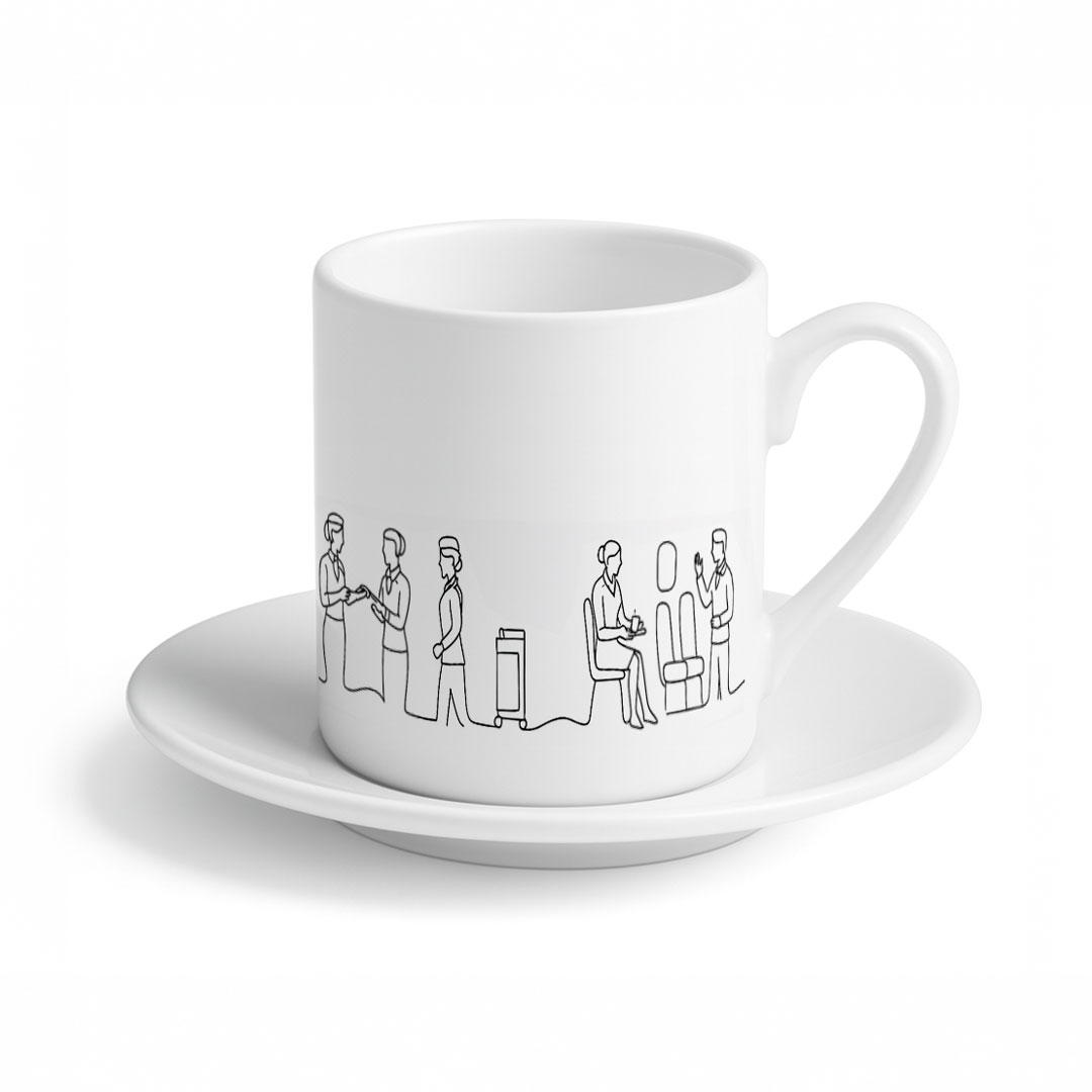 Kabin memurlarının günlük kahve molalarını daha özel hale getirmek için tasarlanan bu fincan, minimalist çizgi figürü ve “CREW” vurgusu ile havacılık ruhunu kusursuz şekilde yansıtır.