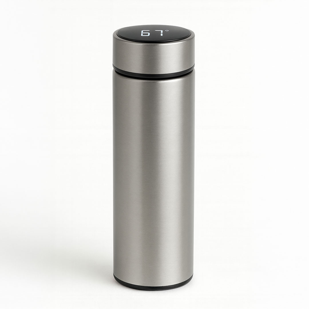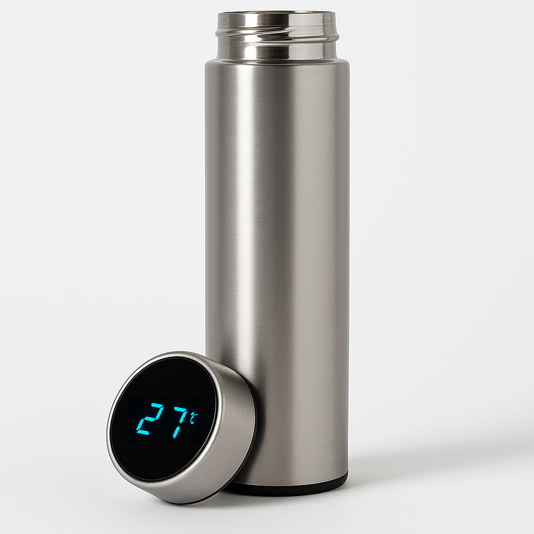 Dijital Göstergeli Termos, gümüş rengi modern çelik gövdesi ile dikkat çeker.